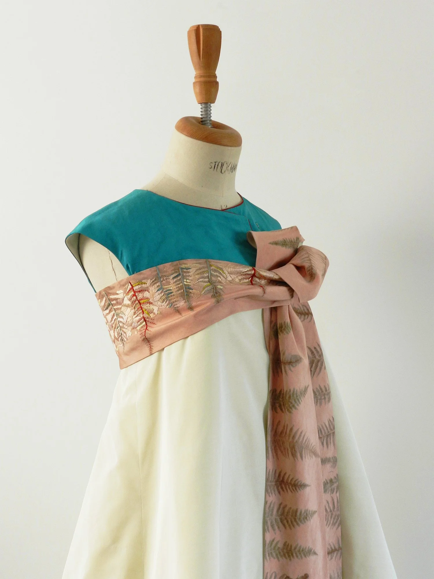 This dress puts our naturally dyed fabric front and centre, while also allowing us to showcase the diverse aspects of our work: embroidery, hand dyeing and printing.